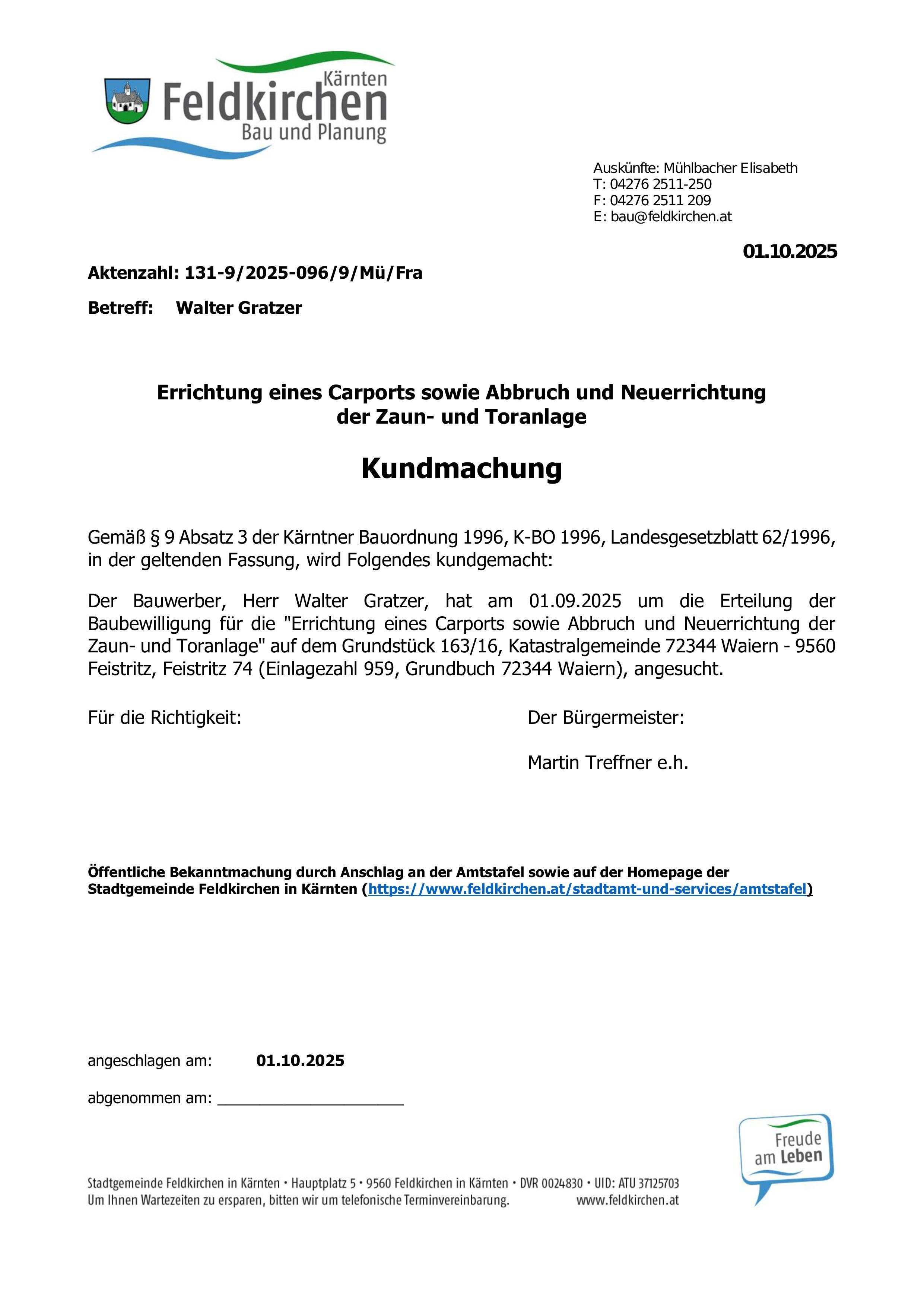 Kundmachung - Errichtung eines Carports sowie Abbruch und Neuerrichtung der Zaun- und Toranlage
