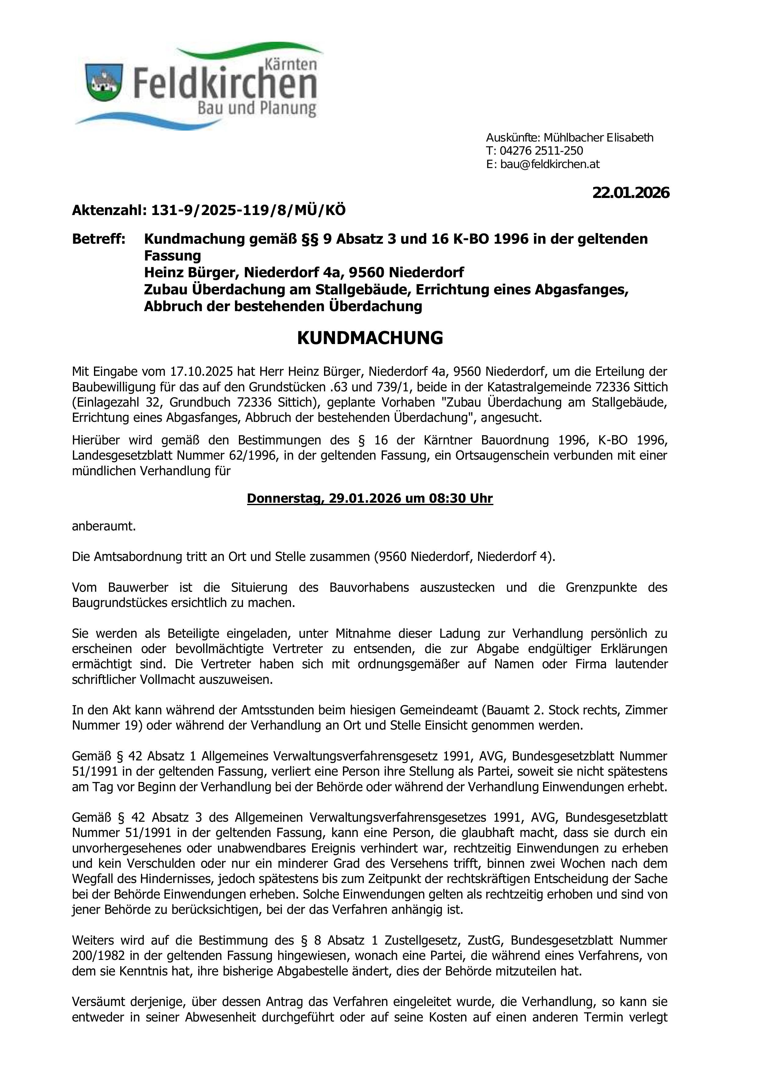 Kundmachung - Zubau Überdachung am Stallgebäude, Errichtung eines Abgasfanges, Abbruch der bestehenden Überdachung